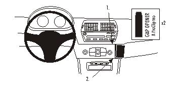 Kérjük, figyelmesen olvassa el az összes utasítást és tanulmányozza a képeket, mielőtt a ProClip-et rögzítené! 1. Helyezze a csomagban található réstágítókat a vékony végükkel a műszerfalon található nyílásba. Körülbelül 10 cm távolságra helyezze őket egymástól. Távolítsa el a ragasztócsík borítását a ProClipről. 2. Nyomja a ProClip felső részének lekerekített szélét a nyílásba a réstágítók közé. Nyomja a ProClip alsó részét lefelé úgy, hogy a felső lekerekített szél beleakadjon a résbe. Húzza ki a réstágítókat. 3. Akassza be a ProClip alsó részét, a tapadó résszel, a műszerfal széle alá. 4. A ProClip a helyére került. |
