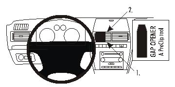 Kérjük, figyelmesen olvassa el az összes utasítást és tanulmányozza a képeket, mielőtt a ProClip-et rögzítené! Megjegyzés: Ez a ProClip belemegy bárhová a levegő befúvó nyílás teljes szélességében. Felszerelhet akár kettő vagy több ProClip-et is egymás mellé. 1. Helyezze a csomagban található réstágítót a vékony felével a levegő befúvó panel kerete és a középső vezérlőpult panel kerete közötti résbe, hogy kitágítsa azt. Nyissa ki a tartó ajtaját a műszerfal tetején. Távolítsa el a ragasztócsík borítását a ProClipről. Tartsa a ProClipet körülbelül vízszintes helyzetben és helyezze a ProClip alsó részének levékonyított szélét a résbe a réstágító mellé. 2. Nyomja a ProClip-et felfelé és előre a levegő befúvó tetejének irányába, hogy a ProClip levékonyított széle beakadjon a középső vezérlő panel kerete mögé. Helyezze a mutató ujját a ProClip felső része alá, emelje felfelé és helyezze a ProClip levékonyított szélét a levegő befúvó peremére. 3. Nyomja le a ProClip-et a felső részénél, hogy a legjobb pozícióba kerüljön ahhoz, hogy a tapadó rész meg tudjon ragadni. Húzza ki a réstágítót 4. A ProClip a helyére került. |
