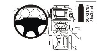 Kérjük, figyelmesen olvassa el az összes utasítást és tanulmányozza a képeket, mielőtt a ProClip-et rögzítené! 1. Helyezze a csomagban található réstágítót a vékony felével a navigációs rendszer és az azt szegélyező panel kerete közötti résbe, hogy kitágítsa azt. Távolítsa el a ragasztócsík borítását a ProClipről. Helyezze a ProClip jobb oldalának levékonyított szélét a kitágított résbe, abba a helyzetbe és magasságba, ahogy a képen látható. 2. Nyomja erősen előre a ProClip jobb oldalát, hogy annak levékonyított széle a résbe menjen a réstágító fölé. Addig kell nyomni, amíg nem látja, vagy érzi/hallja, hogy a helyére kattan. Húzza ki a réstágítót. 3. Helyezze a réstágítót a levegő befúvó panel kerete és a műszerfal kerete közötti résbe. Nyomja erősen előre a ProClip bal oldalát, hogy annak barázdált széle a résbe menjen a réstágító fölé. Addig kell nyomni, amíg nem látja, vagy érzi/hallja, hogy a helyére kattan. Húzza ki a réstágítót. 4. A ProClip a helyére került. |