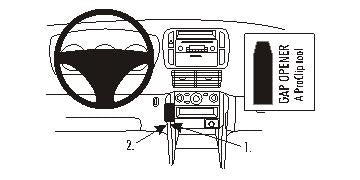 Kérjük, figyelmesen olvassa el az összes utasítást és tanulmányozza a képeket, mielőtt a ProClip-et rögzítené! 1. Helyezze a csomagban található réstágítót a vékony felével a középső vezérlő panel és a középső vezérlő széle közötti résbe, hogy kitágítsa azt. Távolítsa el a ragasztócsík borítását a ProClipről. 2. Akassza a ProClip bal oldalának levékonyított szélét a középső vezérlő oldalfala és a középső konzol panel közötti résbe. 3. Nyomja erősen előre a ProClip bal oldalát, hogy annak levékonyított széle a résbe menjen a réstágító fölé. Addig nyomja, amíg nem látja, vagy hallja/érzi, hogy a helyére kattan. Húzza ki a réstágítót. 4. A ProClip a helyére került. |