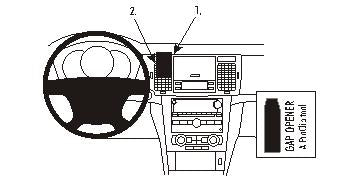 Kérjük, figyelmesen olvassa el az összes utasítást és tanulmányozza a képeket, mielőtt a ProClip-et rögzítené! 1. Helyezze a csomagban található réstágítót a vékony felével a vezérlőpult és a műszerfal közötti résbe, hogy kitágítsa azt. Nyomja a ProClip felső részének barázdált szélét a résbe a réstágító mellé. 2. Tágítsa egy kicsit szélesebbre a rést a réstágítóval, aztán nyomja/csúsztassa a ProClip-et balra, hogy az egyenesbe álljon a levegő befúvó nyílás fölé. 3. Nyomja lefelé a ProClip felső részét és előre a ProClip alsó részét, hogy az alsó részének barázdált széle bekattanjon a helyére a levegő befúvó nyílás felső részébe. Húzza ki a réstágítót. 4. A ProClip a helyére került. |