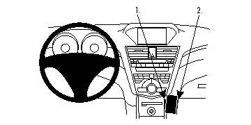 1. Használja a mellékelt alkoholos kendőt, hogy megtisztítsa a területet, ahová a ProClip-et telepíteni fogja. Húzza le a ProClip ragasztószalagjának fedelét. Nyomja a ProClip bal oldalán található szögletes élt a középkonzol panelje és a konzol széle közötti résbe/nyílásba.