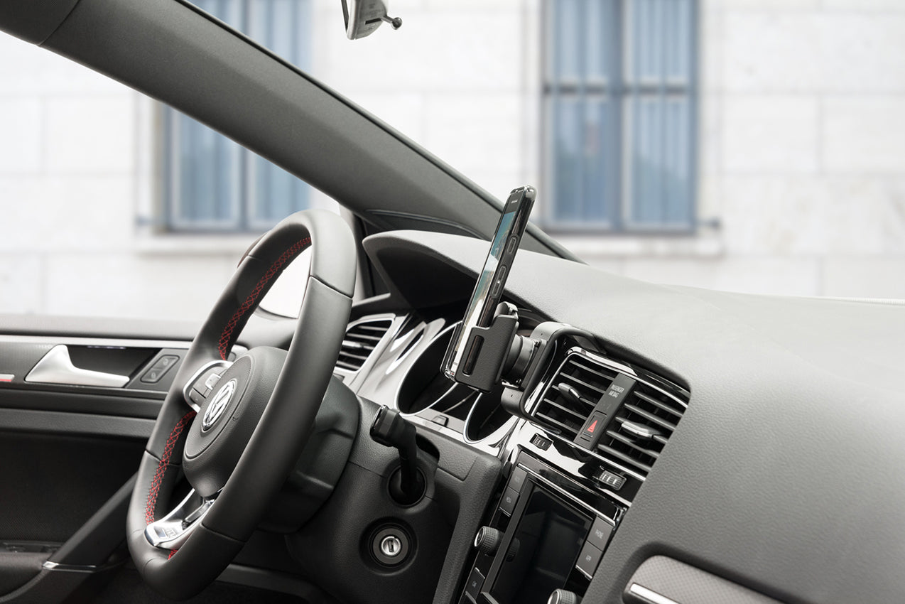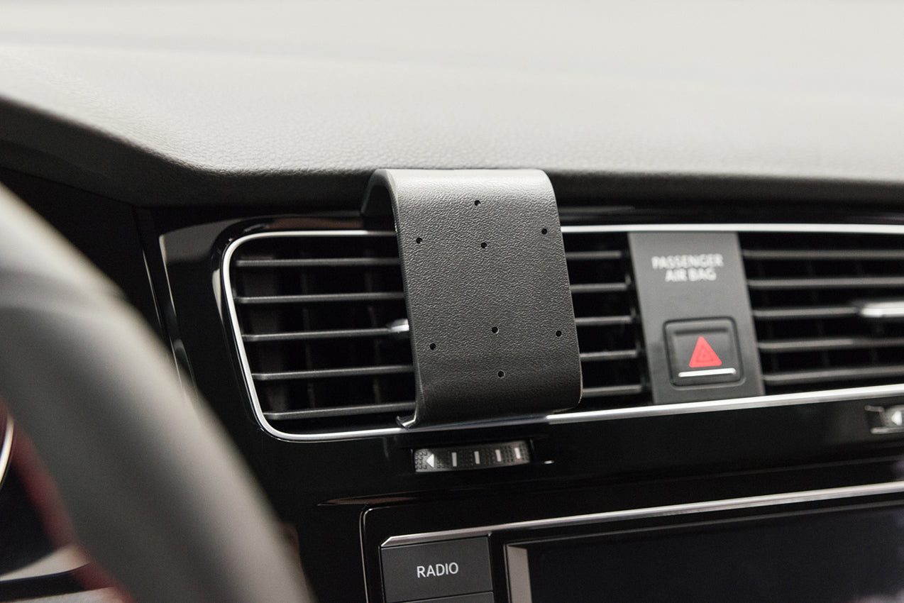 Mielőtt elkezdené a telepítést, kérjük, tekintse meg a képeket és figyelmesen olvassa el a használati útmutatót! Nagyon fontos, hogy a ProClipet pontosan arra a helyre rögzítse, ahol azt a képen látja. 1. A mellékelt alkoholos kendő segítségével tisztítsa meg azt a területet, ahová a ProClip kerülni fog. Nyomja a mellékelt réstágító vékonyabbik felét a szellőzőrács és a műszerfal közti résbe, így kiszélesíti azt. Távolítsa el az öntapadós matricát a ProClipről. Nyomja a ProClip felső részén található elgörbített részt a résbe, a réstágító mellé. 2. Nyomja a ProClip alsó részét felfelé/előre. Akassza be a ProClip alsó élét a szellőzőrács alsó részébe. 3. Határozottan nyomja meg úgy a ProClipet, hogy az öntapadós matrica ténylegesen rögzüljön. Húzza ki a réstágítót. 4. A ProClip a helyére került. |