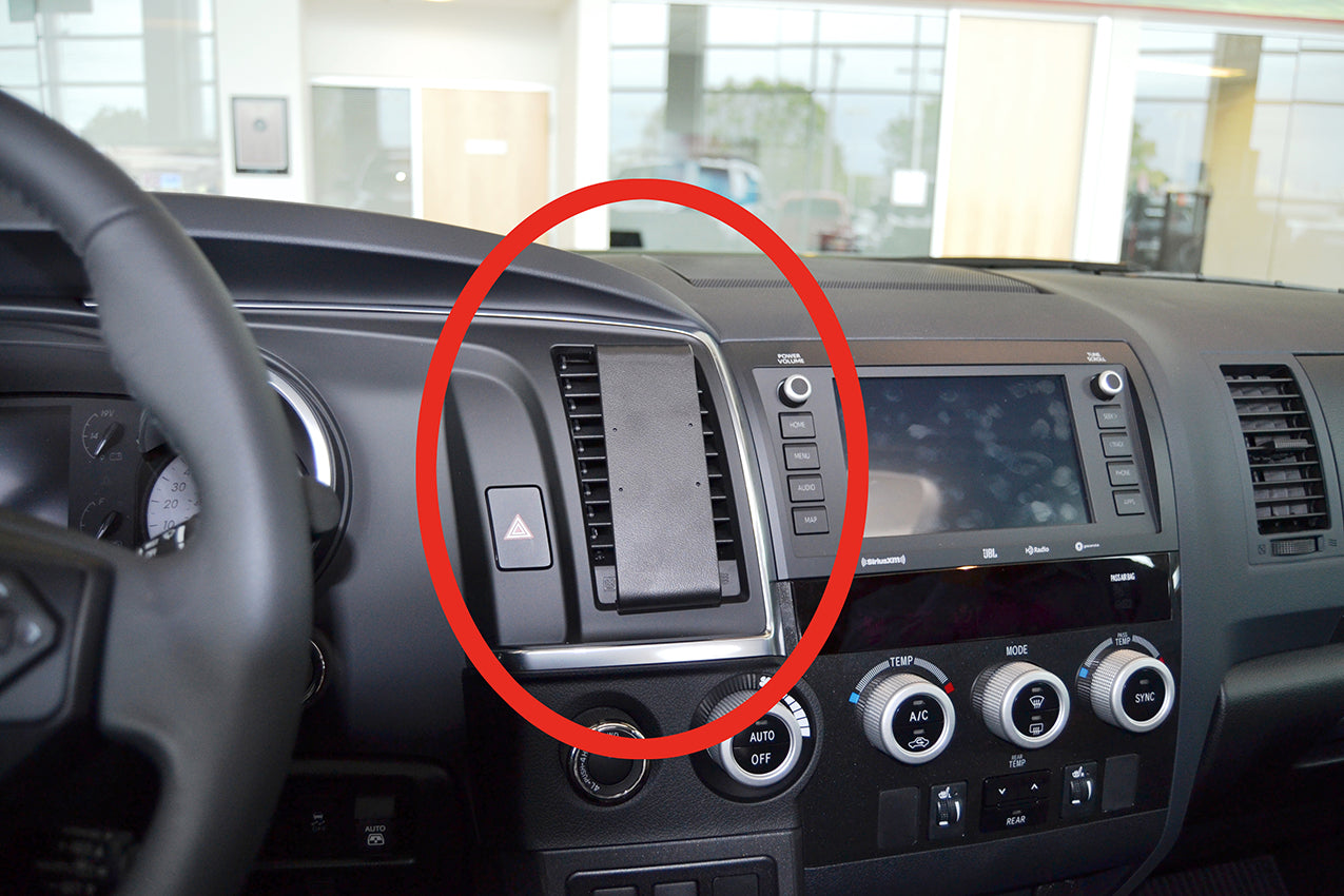 1. Use the enclosed alcohol pad to clean the area where the ProClip is to be installed. Peel off the adhesive tape cover on the the ProClip. Press the thin edge on the lower part of the ProClip into the gap between the air vent panel and the surrounding frame.
