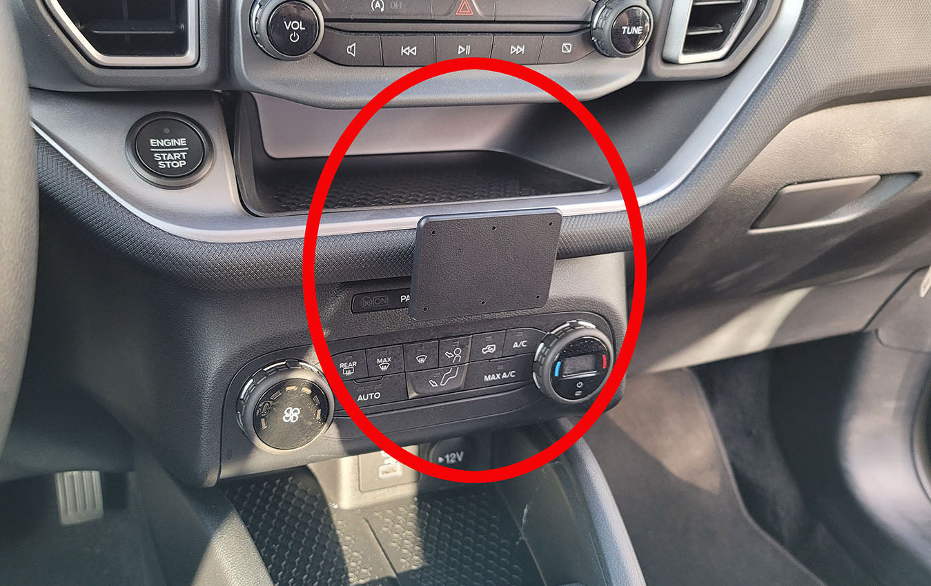 1. A jármű egy tárolóval rendelkezik a kijelző alatt. A ProClipet a tároló és a hőmérséklet szabályozó közötti területre kell rögzíteni. Tartsa a ProClipet úgy, hogy a hosszabbik kar lefelé nézzen. Keresse meg a tároló alatt található szegélyt: a műszerfal puha burkolata és a hőmérséklet szabályozót körülvevő kemény keret között. Helyezze a ProClip alsó élét ebbe a résbe.
