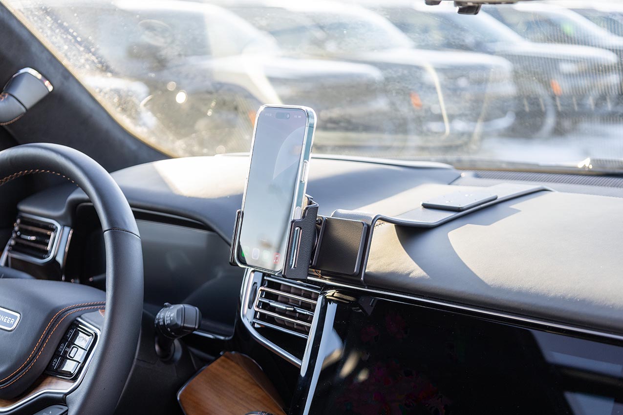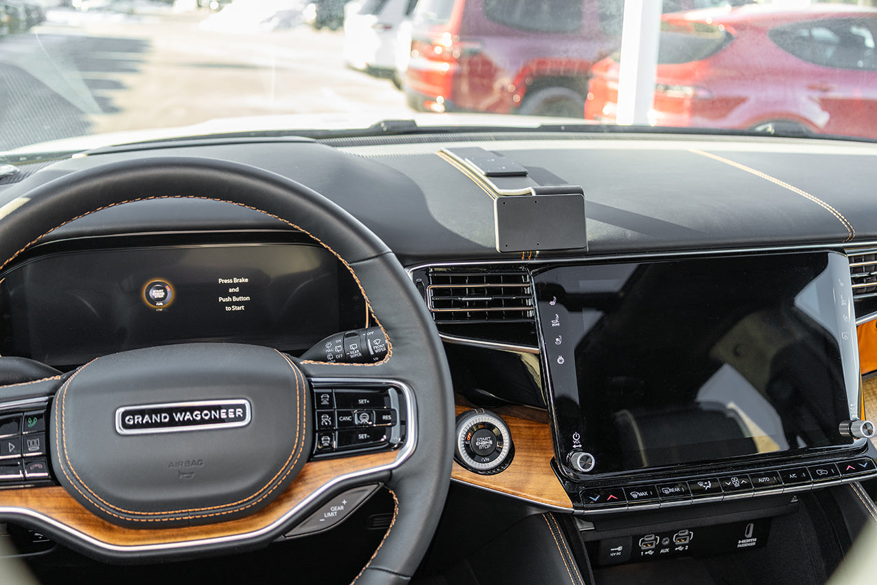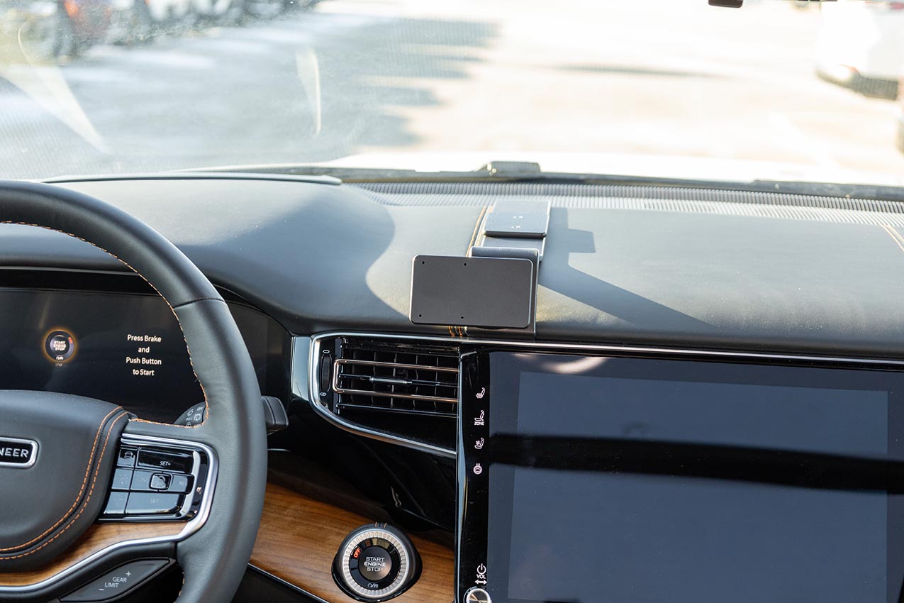 3. Mindkét kezével húzza előre és lefelé a tartó elejét, és helyezze az első peremet a bőr és a műszerfal felső díszléce közötti résbe. Nyomja meg határozottan a tartó elejét, hogy biztosítsa, hogy a perem teljesen beilleszkedjen a résbe.