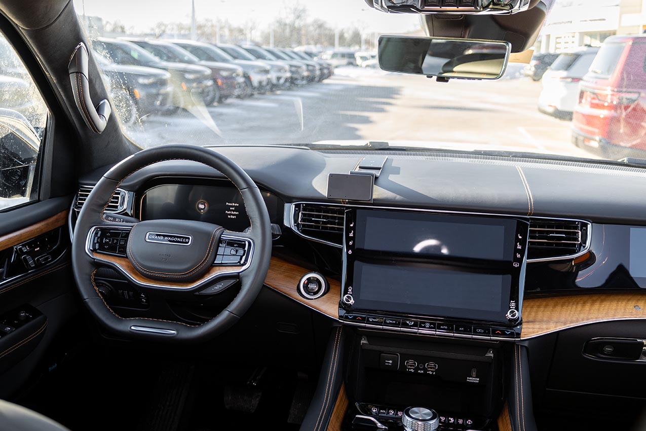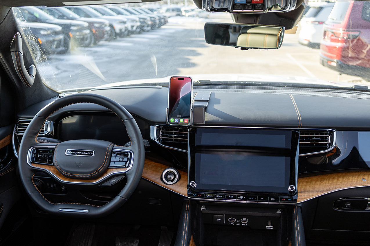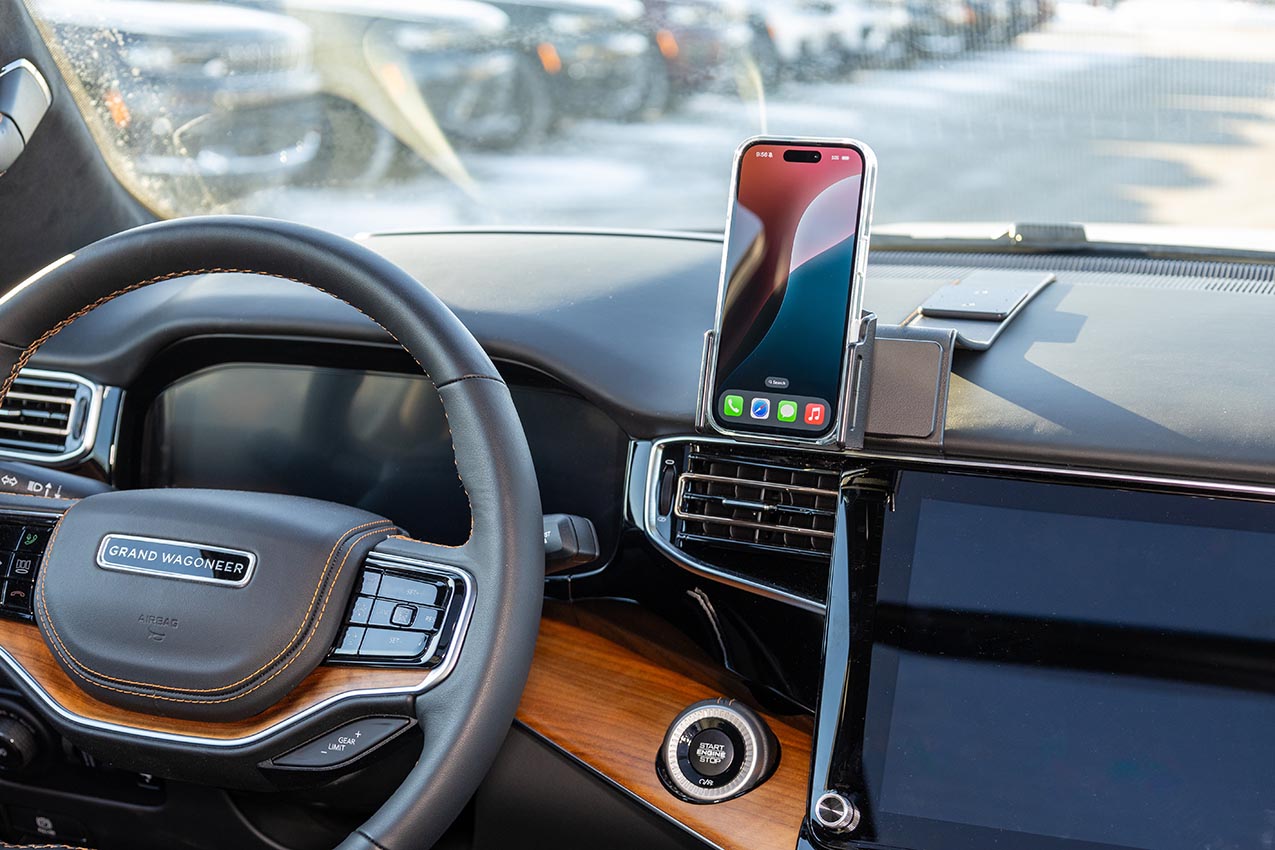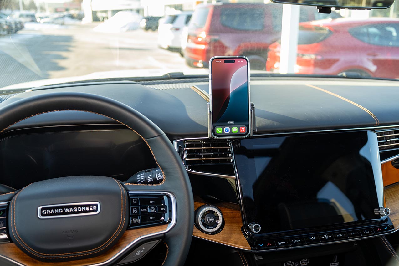 3. Mindkét kezével húzza előre és lefelé a tartó elejét, és helyezze az első peremet a bőr és a műszerfal felső díszléce közötti résbe. Nyomja meg határozottan a tartó elejét, hogy biztosítsa, hogy a perem teljesen beilleszkedjen a résbe.