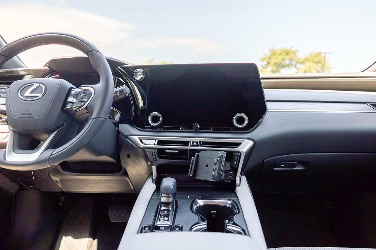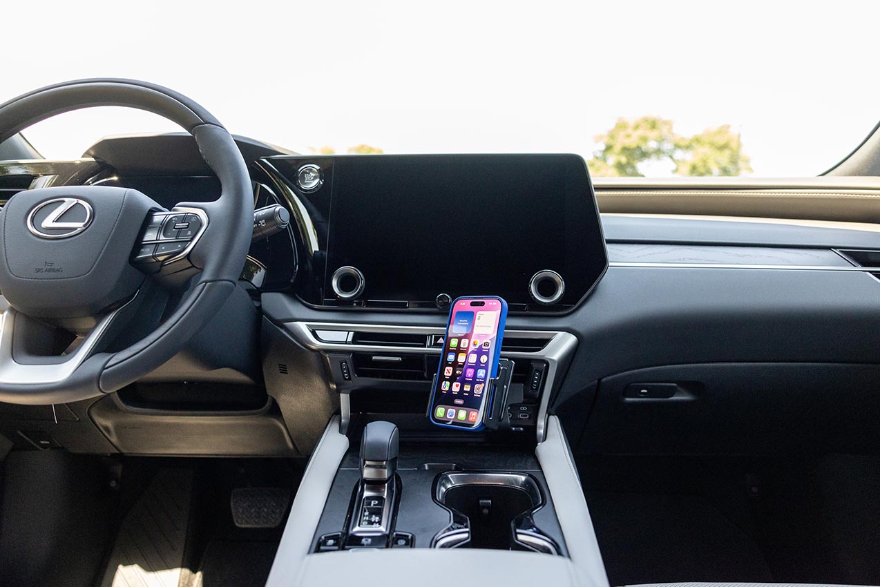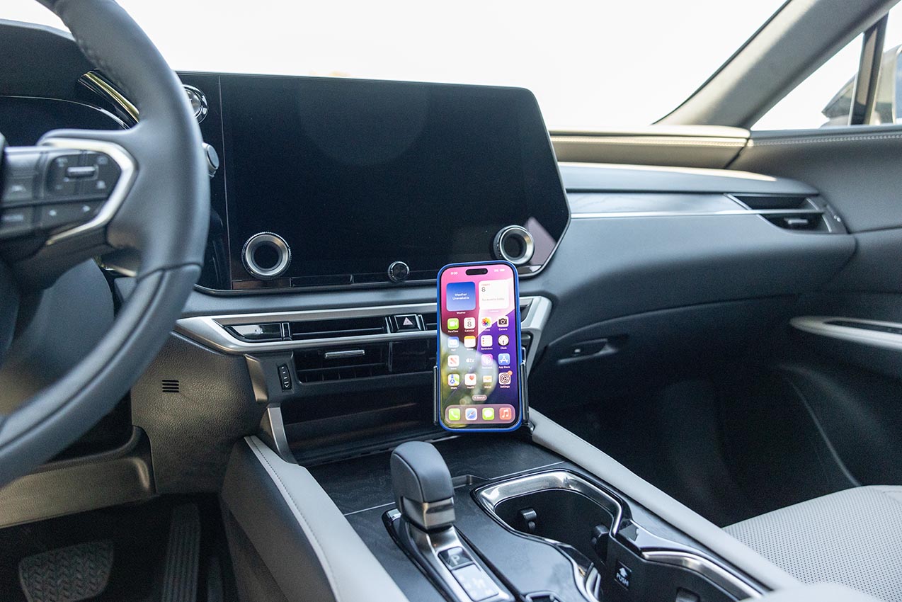 1. A mellékelt alkoholos párnával tisztítsa meg azt a területet, ahová a tartó felszerelésre kerül. Húzza le a ragasztószalagos borítást. Nyomja a tartó vékony alsó szélét a rekesz és a középkonzol közötti résbe.
