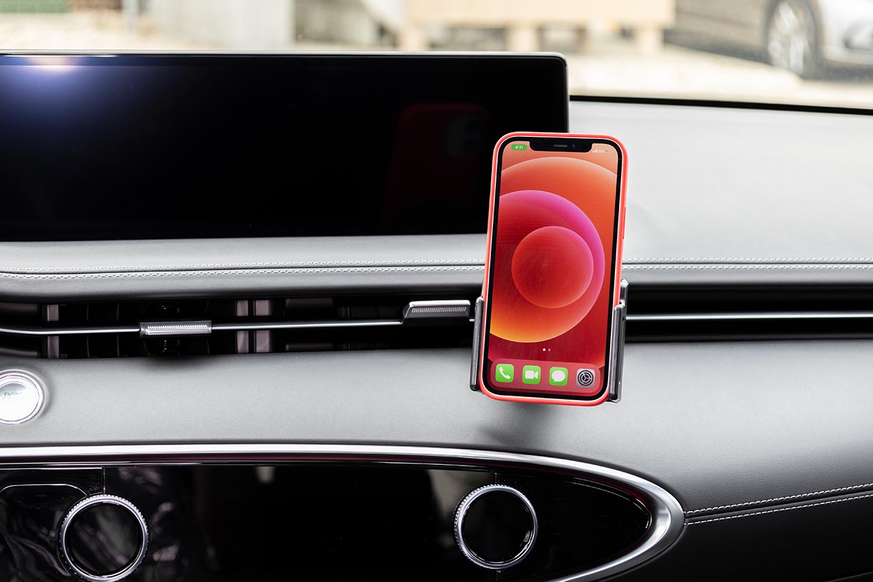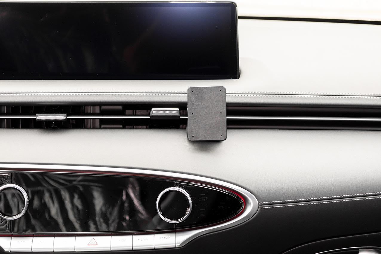 3. Nyomja lefelé és előre a tartó felső részét. Akassza/csíptesse be a felső élét a szellőzőház felső résébe. Nyomja meg a felső és alsó ajkak belső oldalát, hogy biztosítsa, hogy teljesen behelyeződjenek a résekbe, és a ragasztószalag teljes mértékben érintkezzen a műszerfallal.