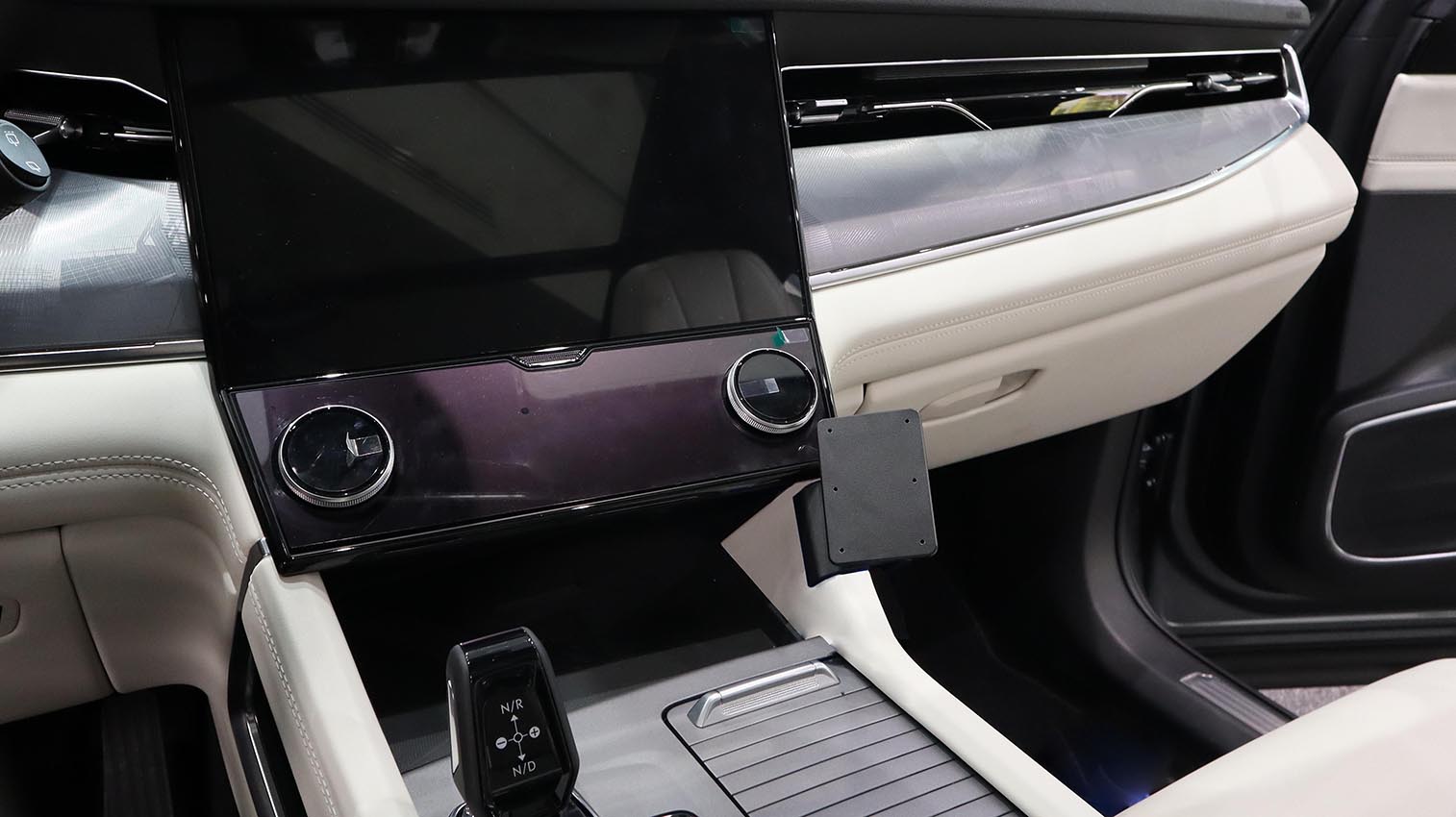 1. Helyezze a tartót a középkonzol kerete fölé. Akassza a tartó bal szélét a keret fölé.