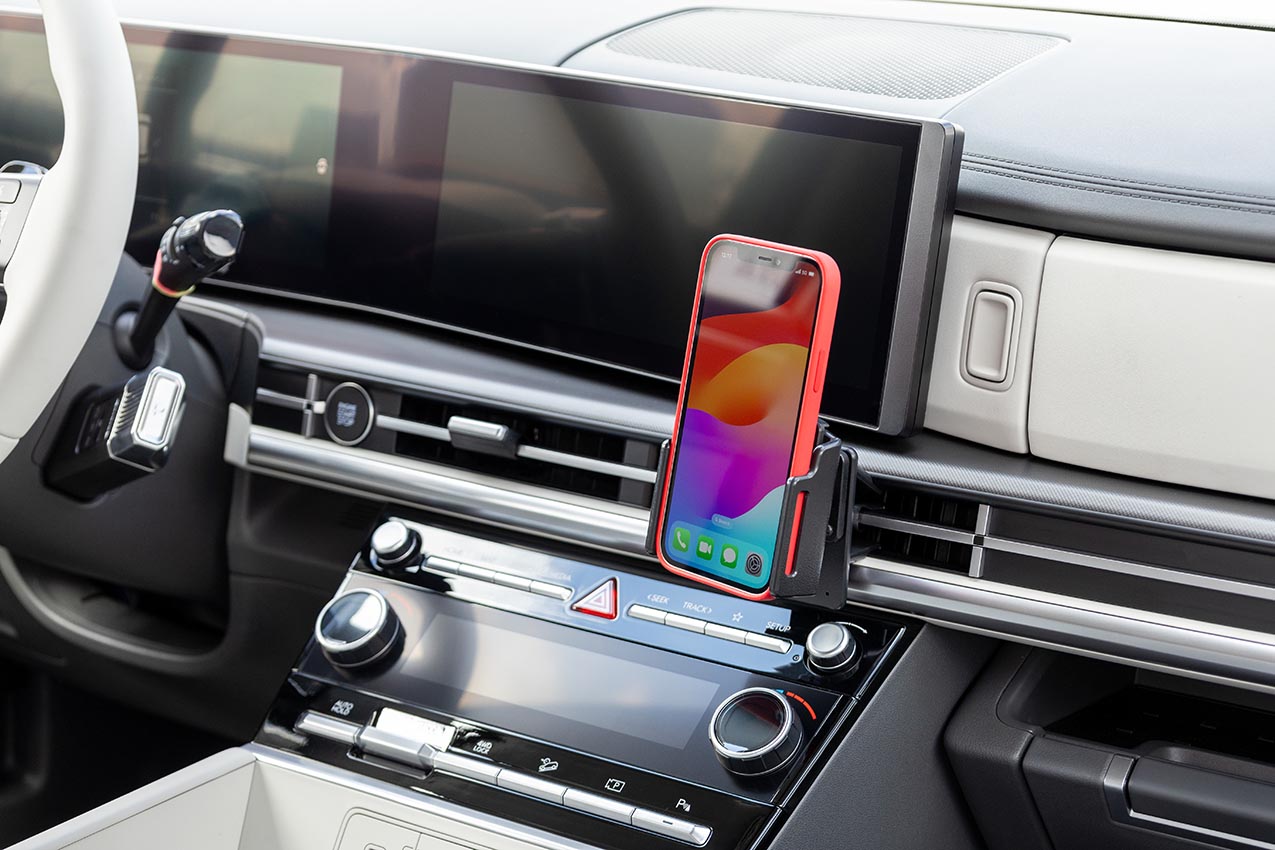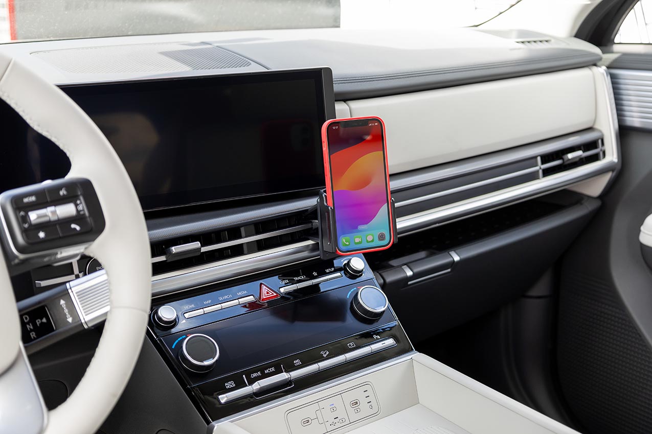 2. Press the top of the mount forward so the upper edge hooks into the air vent housing. Make sure the grooves of the edges conform to the air vent housing and press on the insides of the mount to make sure the tape makes full contact with the trim.