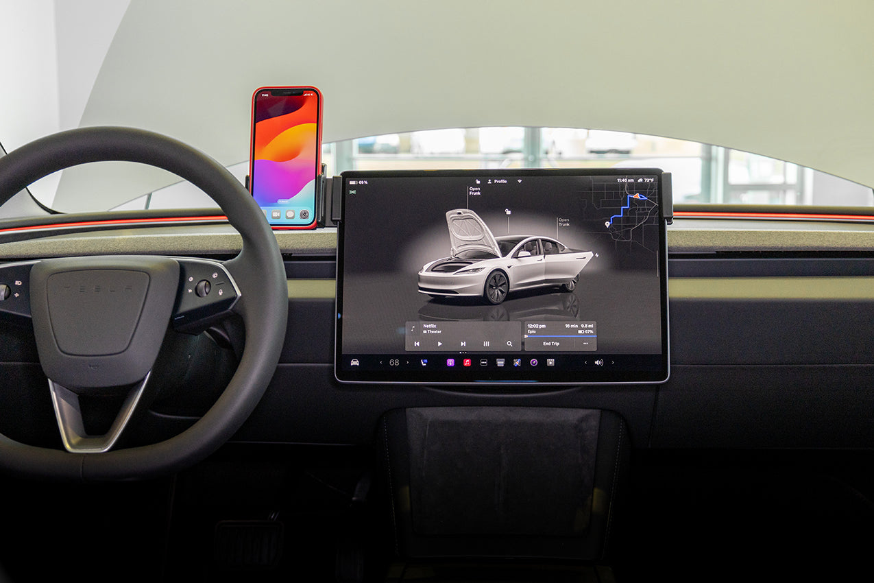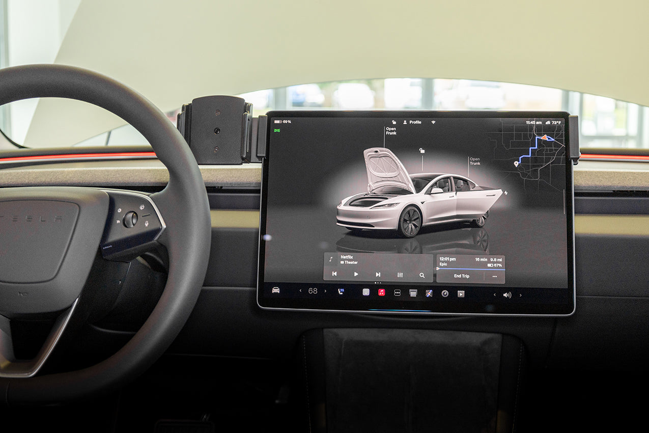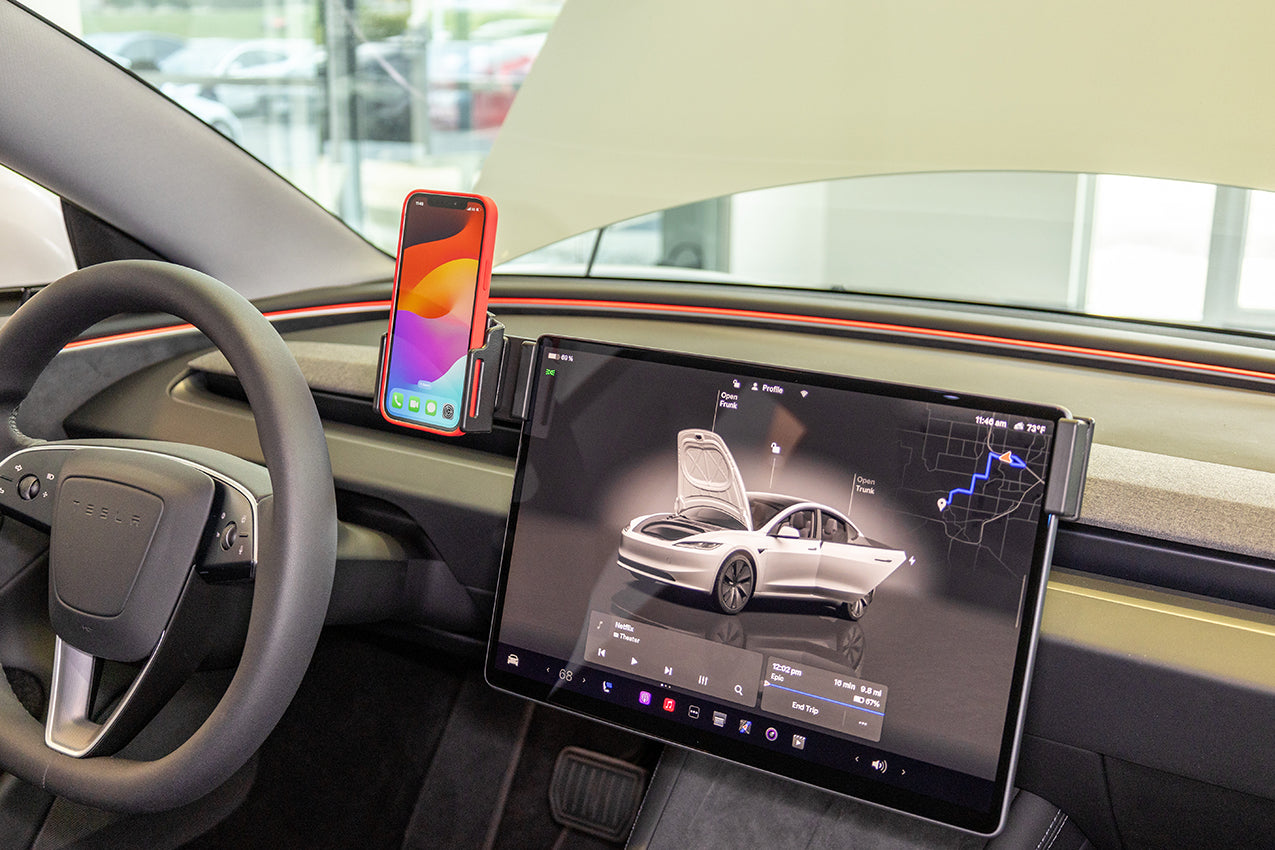 3. Hold the mount over the screen so the mounting plate is on the driver's side. Slowly and firmly, press down on both sides of the mount to slide/hook it onto the screen. Gently flex the sides out to ease the installation. Press downward until the mount is securely in place.
