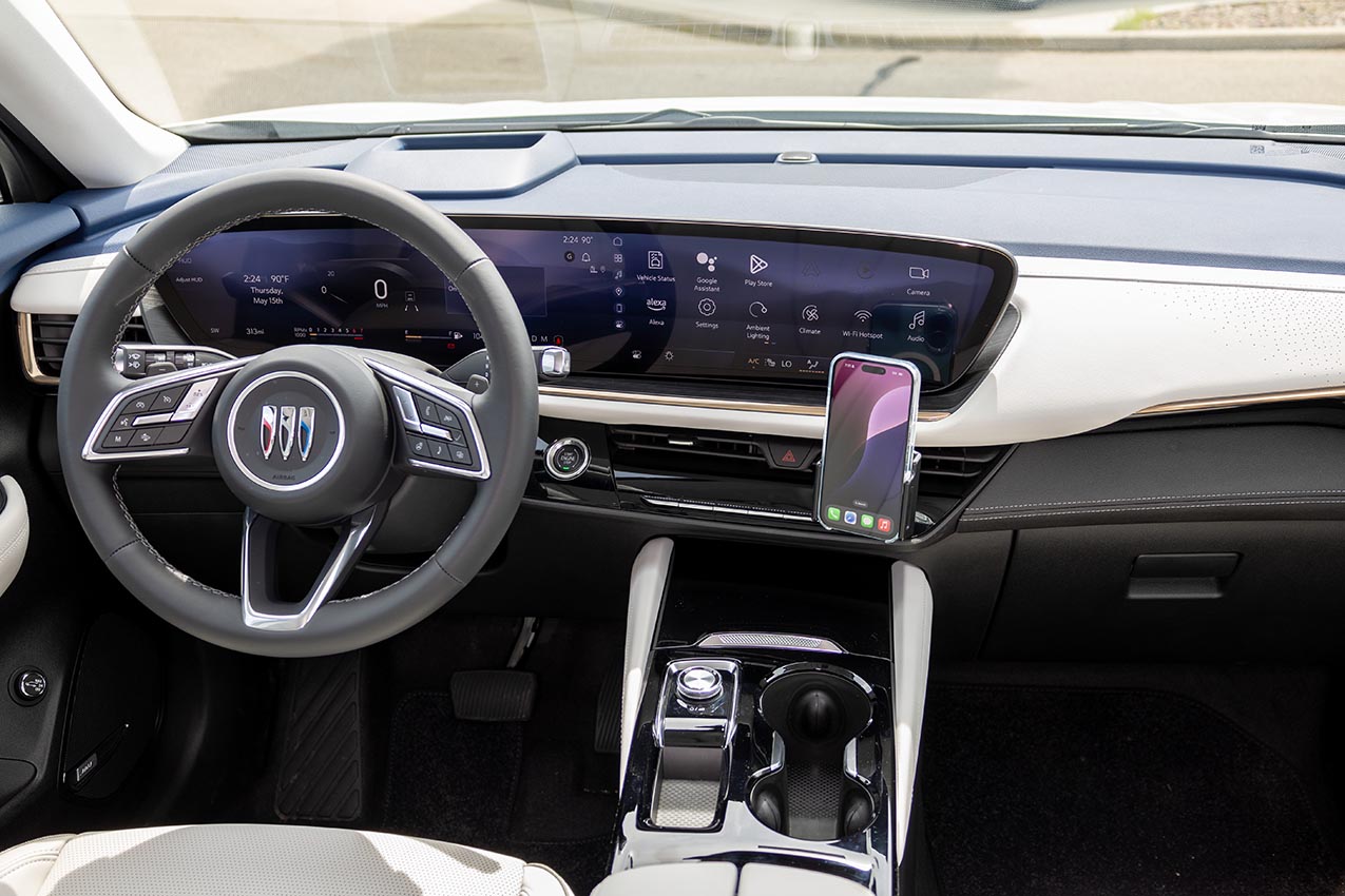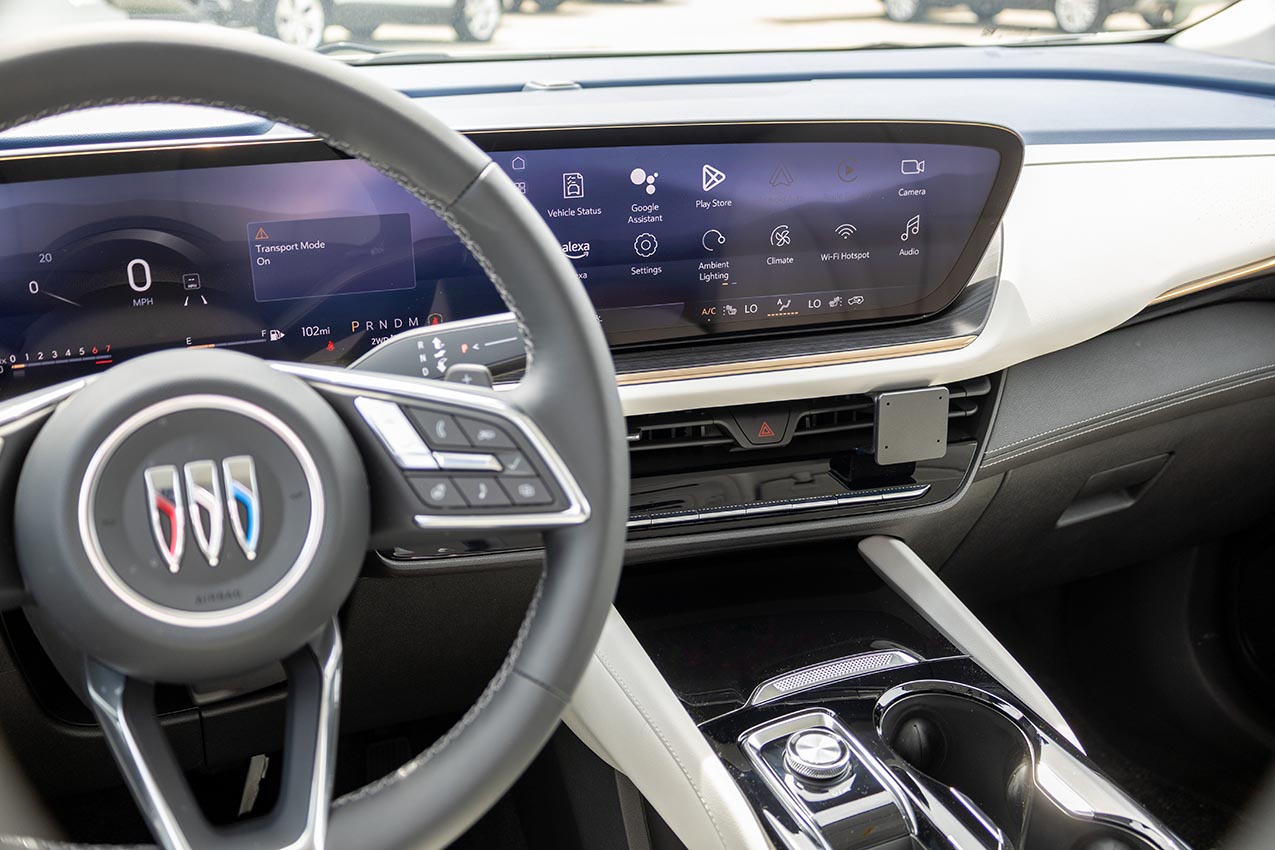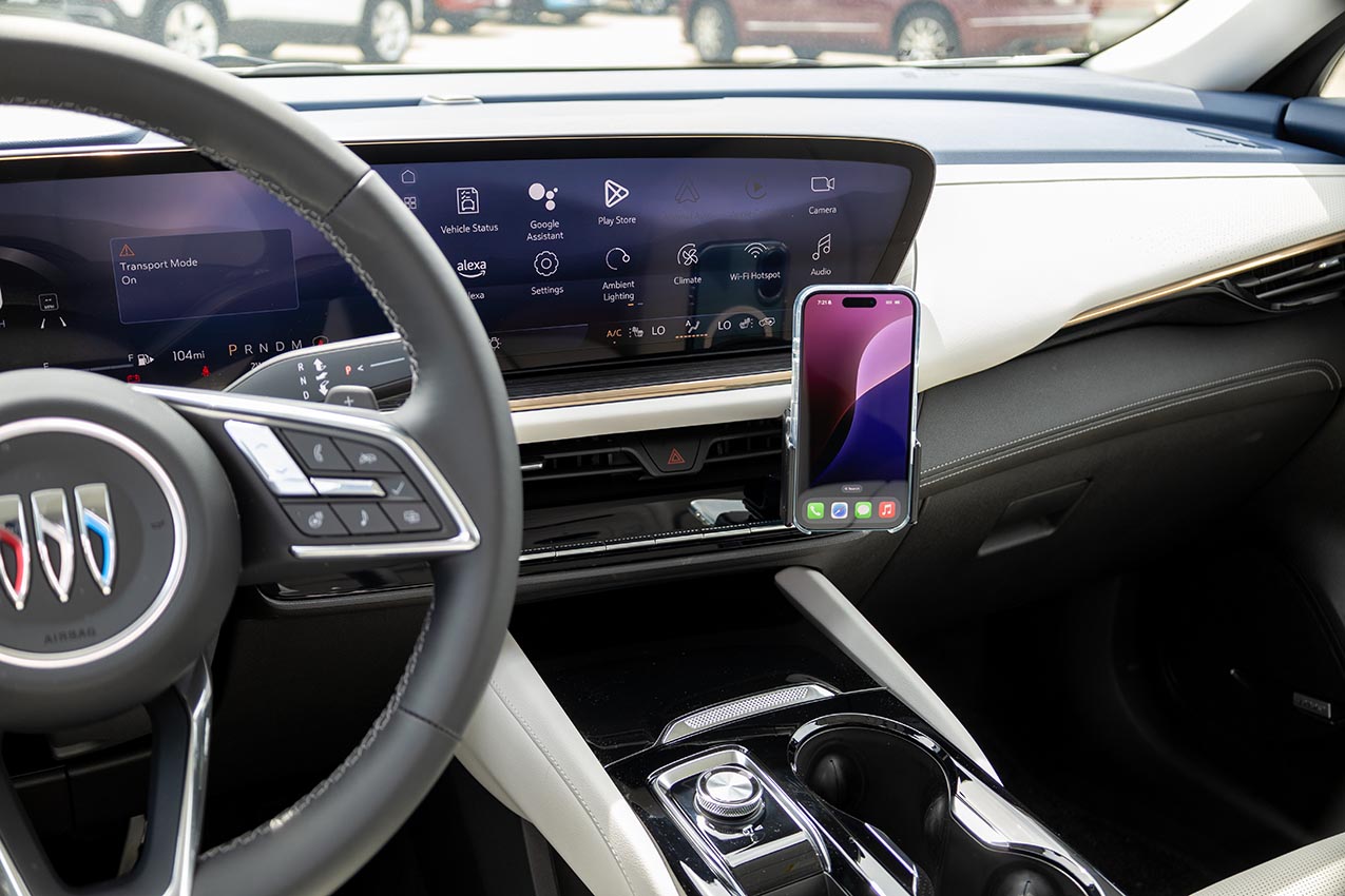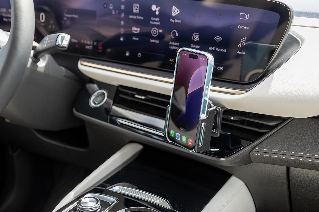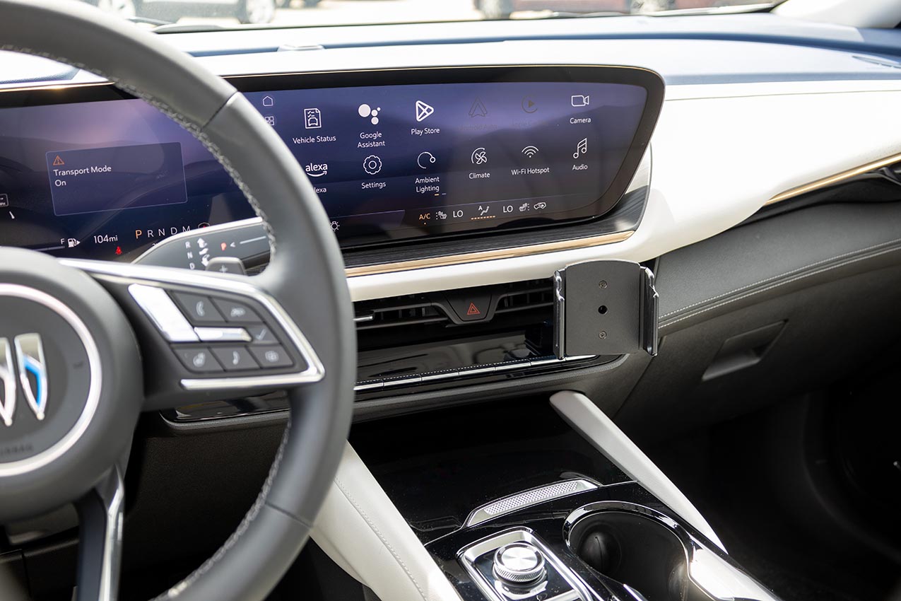 2. Press the upper edge of the mount into the gap next to the gap opener, so the cutout is position by the trim clip inside the gap. Pull out the gap opener and press it into the gap between the air vent housing and the climate controls display panel.